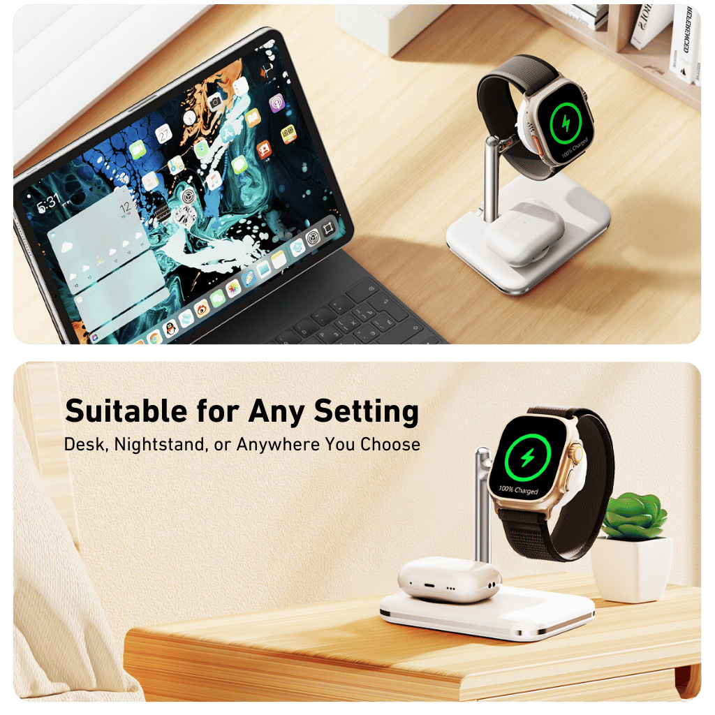 Perfect for your desk, nightstand, or any spot you choose, this 2-in-1 charger provides convenient and flexible charging solutions wherever you need them.