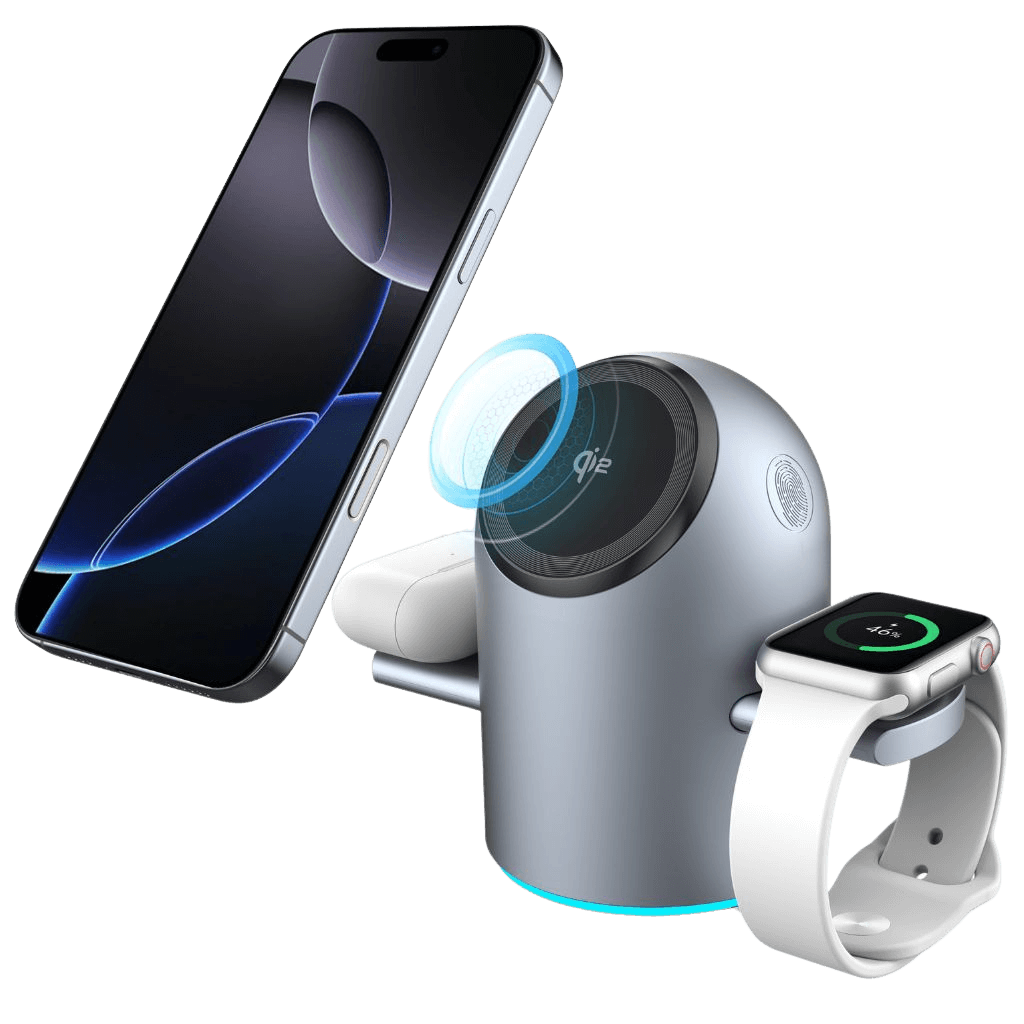 No more clutter or multiple cords. Charge your iPhone, Apple Watch, and AirPods all at the same time with this sleek, 3-in-1 wireless charger — designed for maximum efficiency.