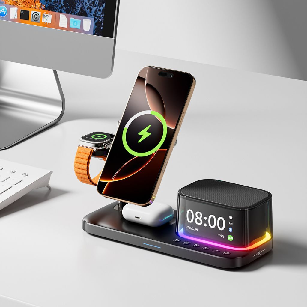 Fast charging, clear audio, smart alarm, and ambient light in a single magnetic stand.